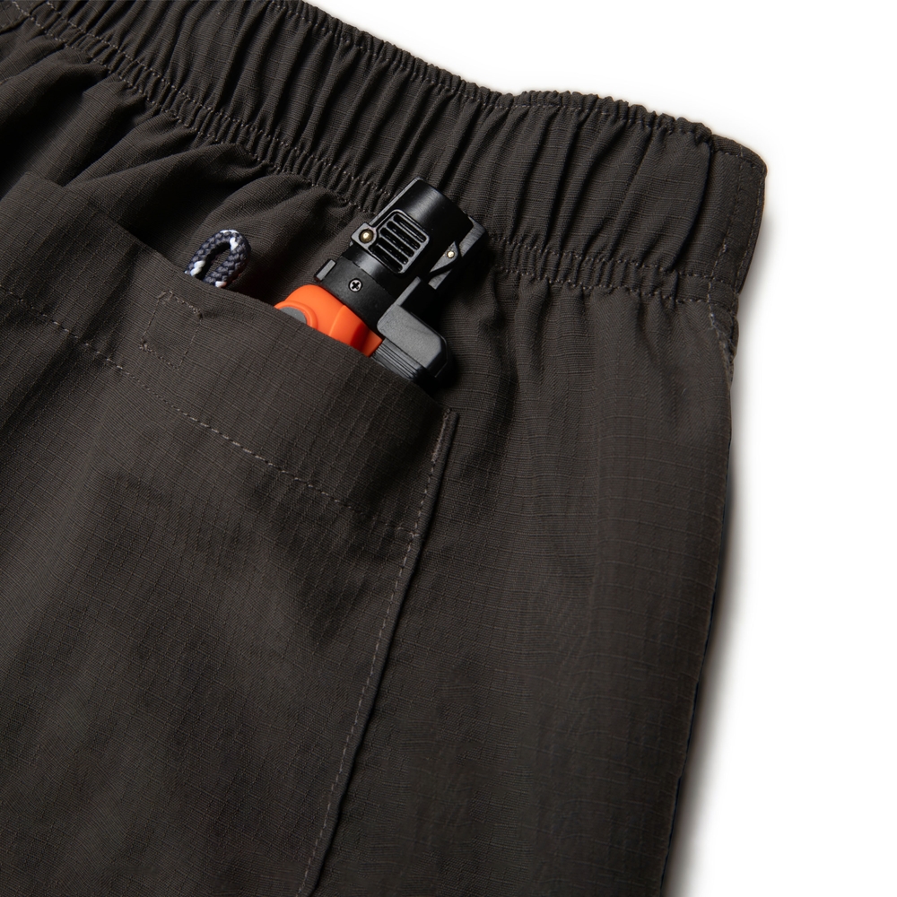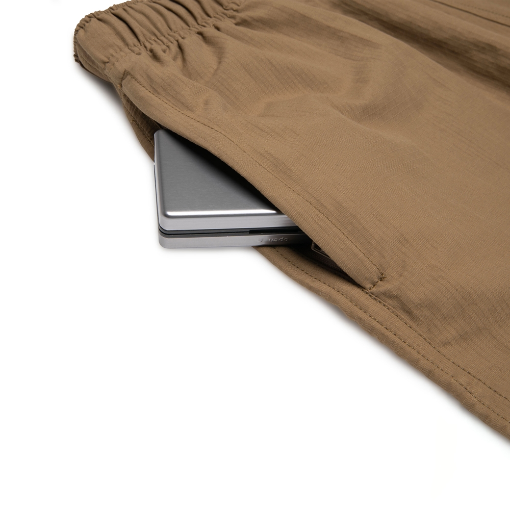 靈感源自美軍運動短褲,設計上延續寬鬆短襬的版型,並特別挑選防潑水布料,不僅提升褲款的防潑水功能,還增強其抗汙性,使其更適合應對各種戶外活動或者日常穿搭。此短褲不僅注重舒適度,更融合實用性與經典元素。